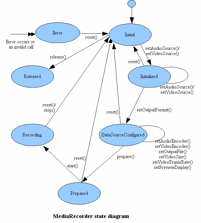// Android Developer 의 MediaRecorder API Guide 를 참고하면, MediaRecorder 는 아래와 같은 state machine 을 갖습니다.