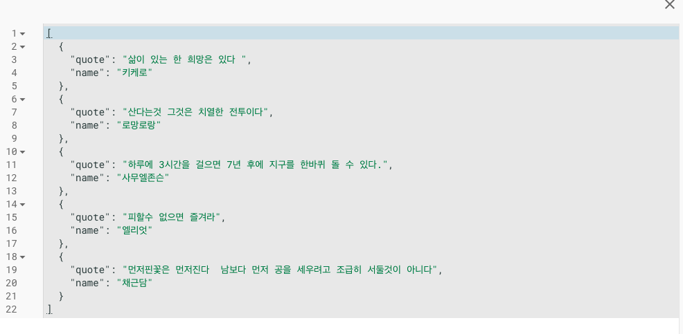 [{"quote":"삶이 있는 한 희망은 있다 ","name":"키케로"},{"quote":"산다는것 그것은 치열한 전투이다","name":"로망로랑"},{"quote":"하루에 3시간을 걸으면 7년 후에 지구를 한바퀴 돌 수 있다.","name":"사무엘존슨"},{"quote":"피할수 없으면 즐겨라","name":"엘리엇"},{"quote":"먼저핀꽃은 먼저진다 남보다 먼저 공을 세우려고 조급히 서둘것이 아니다","name":"채근담"}]
