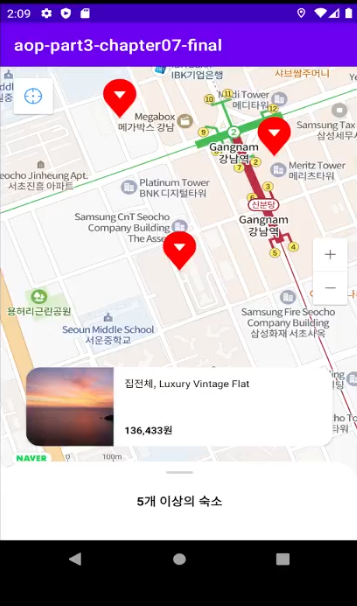 Mock API 에서 예약가능 숙소 목록을 받아와서 지도에 표시할 수 있음.