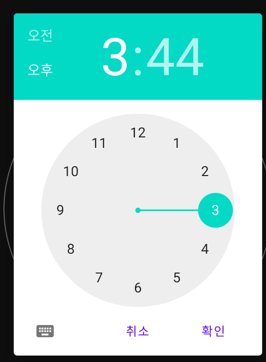 위의 기능을 이용하여 캘린더를 이용한 현재시간을 가져올 수 있다. 그리고 TimePickerDialog를 이용해 아래와 같이 가져올 수 있다.