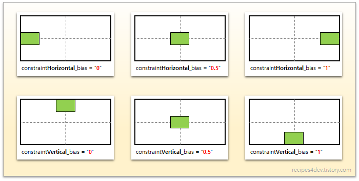 * layout_constraintHorizontal_bias - 수평 방향(Left/Right 또는 Start/End) 사이드 제약 시, 양 사이드 간 위치 비율.