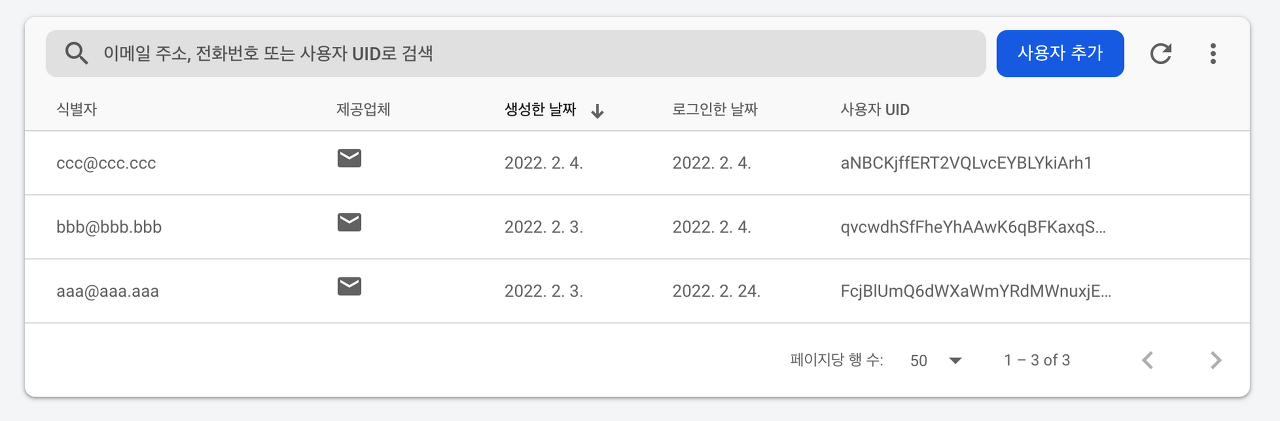 위에는 만들어진 User Database와 회원가입된 유저목록이 실시간으로 반영된다.