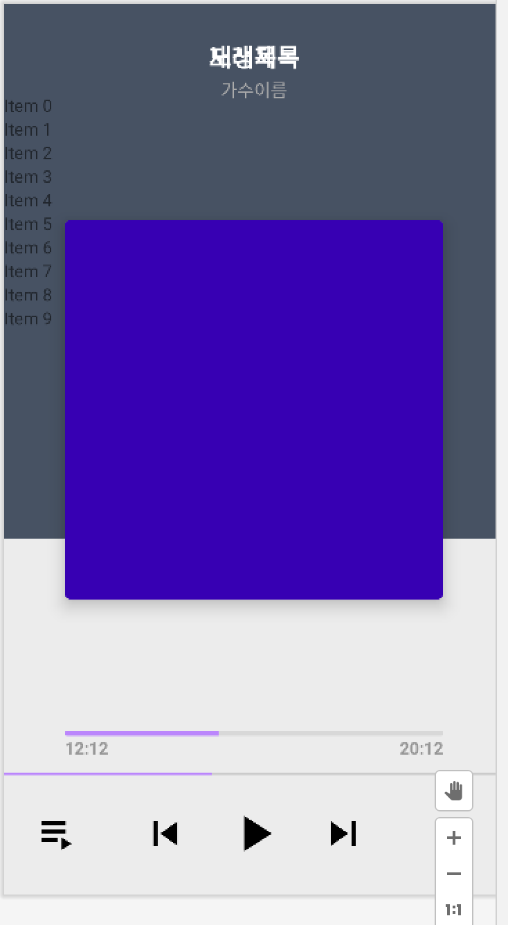 센터에 있는 음악의 커버이미지가 들어갈 수 있는 파란색 cardView영역은 조금 떠 있는 듯 한 느낌이 든다. 그것은 cardview의 cardElevation = 10dp로 설정해주어 입체적인 느낌을 주었고 cardView의 위치를 translationY = 30dp 정도 주어 아래로 30dp만큼 위치 시켜주어 자연스럽게 위치를 설정해주었다.