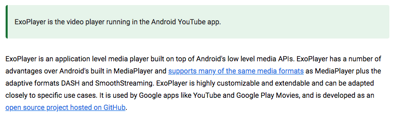 구글에서 만든 오픈 소스 미디어 플레이 라이브러리 입니다. 기존에 오디오와 비디오 재생은 MediaPlayer를 사용했었지만 ExoPlayer가 나온 이후에는 MediaPlayer 보다 더욱 작고 유연하며 안정적이므로 많은 개발자들이 사용하는 오픈 소스 라이브러리가 되었습니다. 물론 우리가 즐겨보는 유튜브와 구글 무비도 ExoPlayer 를 사용해서 만들었습니다.