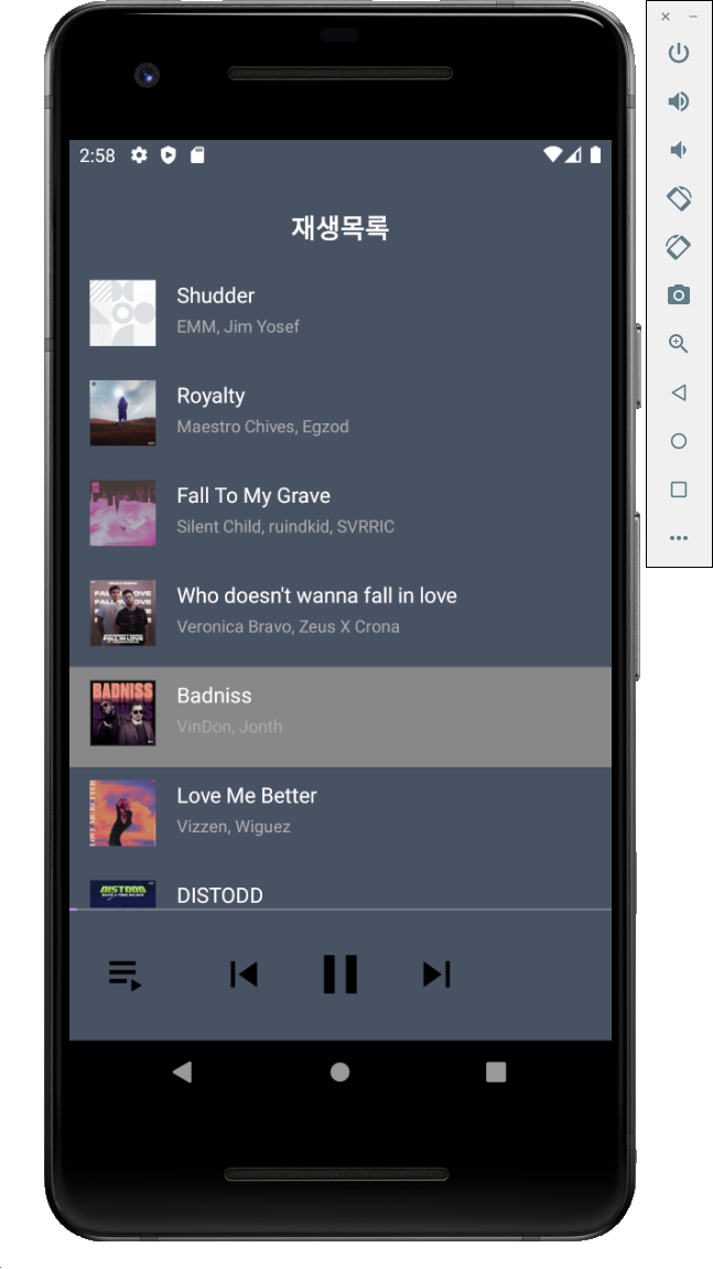 재생 목록을 클릭하여 ExoPlayer 를 이용하여 음악을 재생할 수 있음.