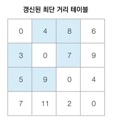 - 이후, 각 노드에 대해 각각, 각 노드를 거쳐가는 경우를 확인하여 전체 테이블을 갱신