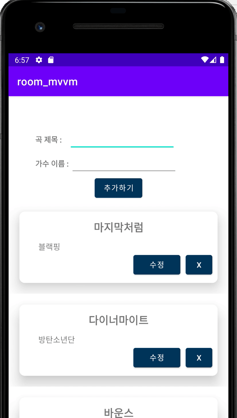 오늘 알아본 것은 LIVEDATA 와 ROOM을 활용해 만든 간단한 앱이다. 위 와같이 Create, Update, Delete가 가능한 Room DB를 MVVM패턴으로 구현해보았다.!!
