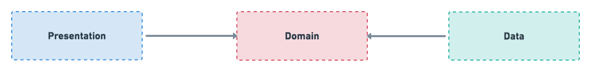 총 3개의 계층이 존재하게 된다, Data -> Domain -> Presentation 각 레이어는 의존성 주입을 역으로 해주는 구조를 가지고 있다. 그리고 꼭 한방향만 지향한다