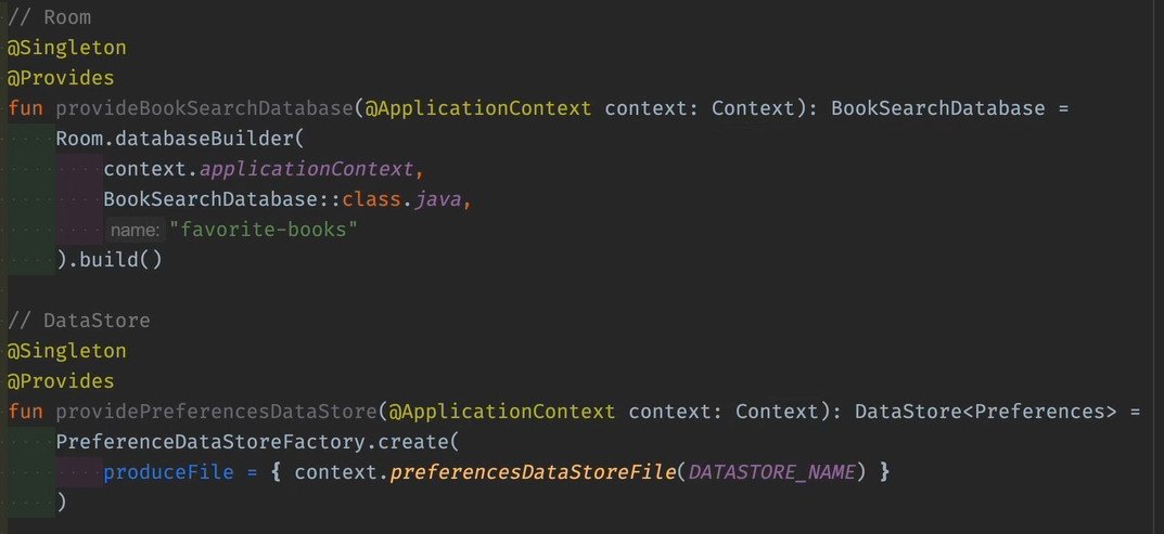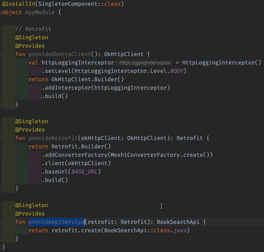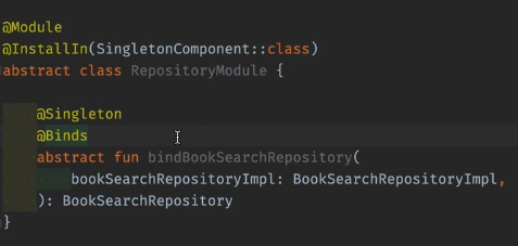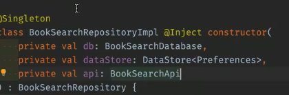 - @Singleton을 붙여 의존성 주입 가능한 Scope로 지정해줌, 그러면 Inject constructor(여기 안에 객체들은 Hilt가 주입을 하게 된다.)