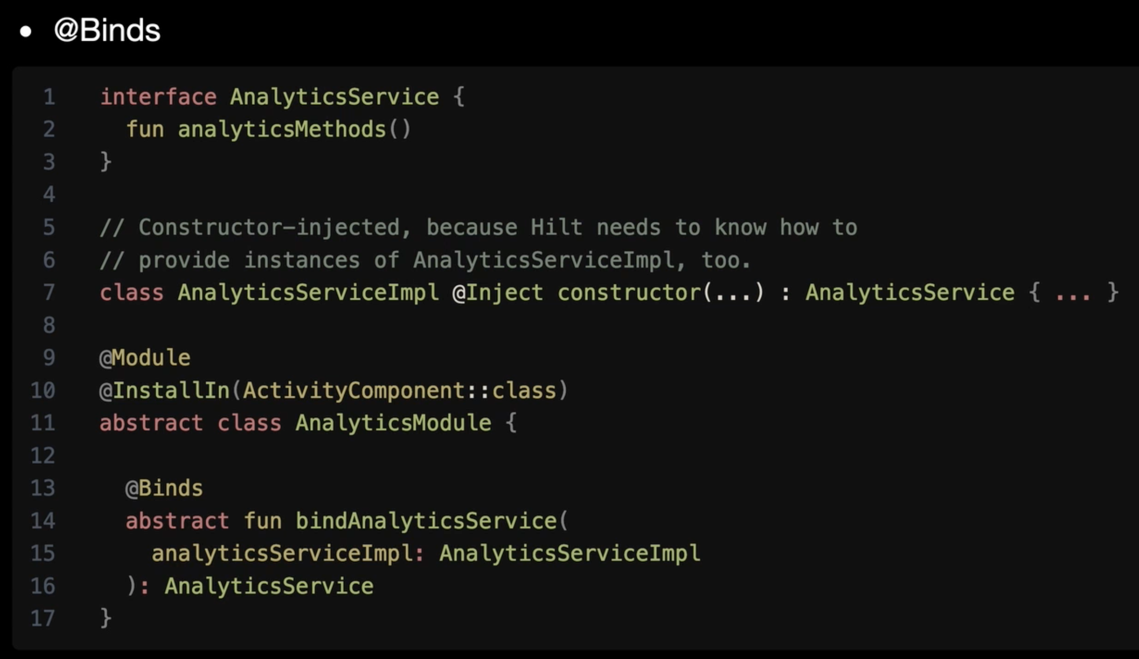 ㅁ AnalyticsService라는 Interface를 의존객체로 제공하기위해서는 Binds