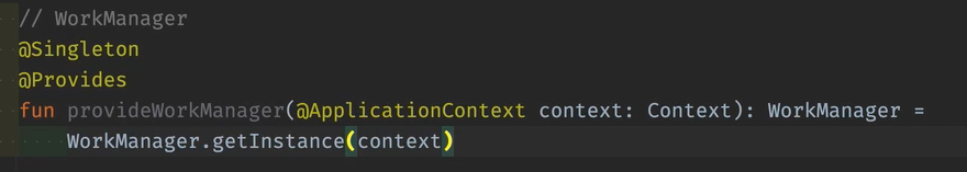 3) 모듈 안에는 AnalyticsService로 반환하는 함수가 있는데 이 함수에 Provides를 붙임으로서 AnalyticsModule이 AnalyticsService의 의존성을 외부로 전달할 수 있게 된다.