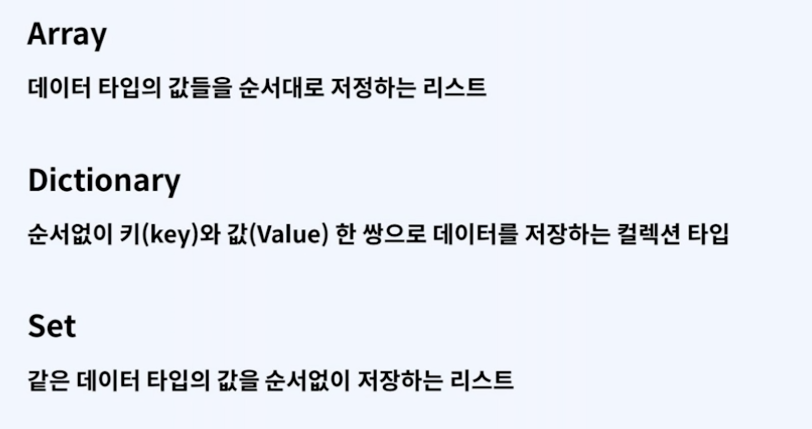 - 저장된 요소는 정렬되지 않는다.(Unordered Collection) - 정렬의 의미가 없음.