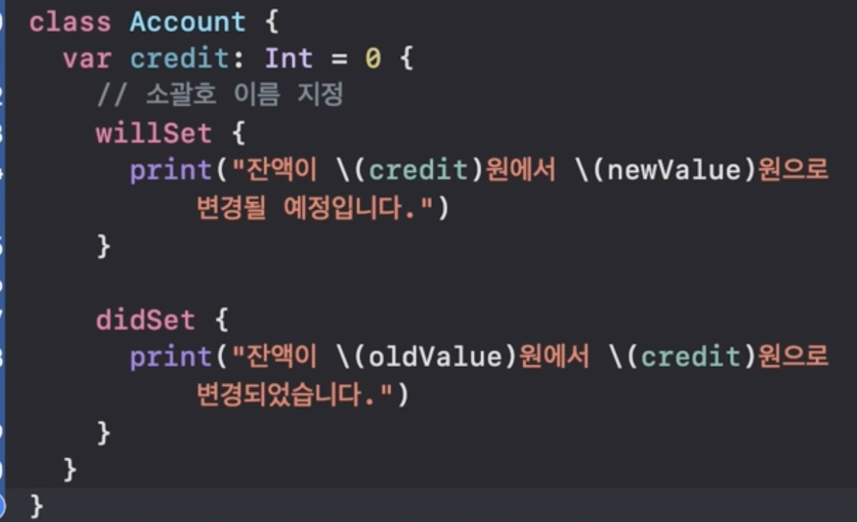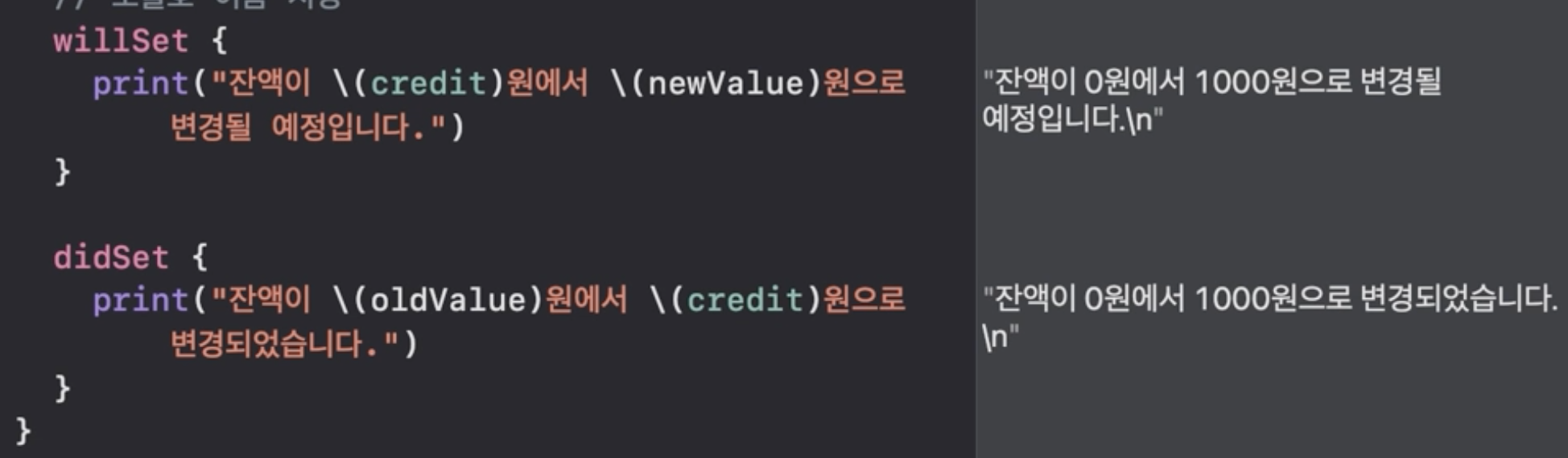 - 값이 변경된 직후에 호출되는 didSet 메서드 + oldValue 변경되기 전의 값