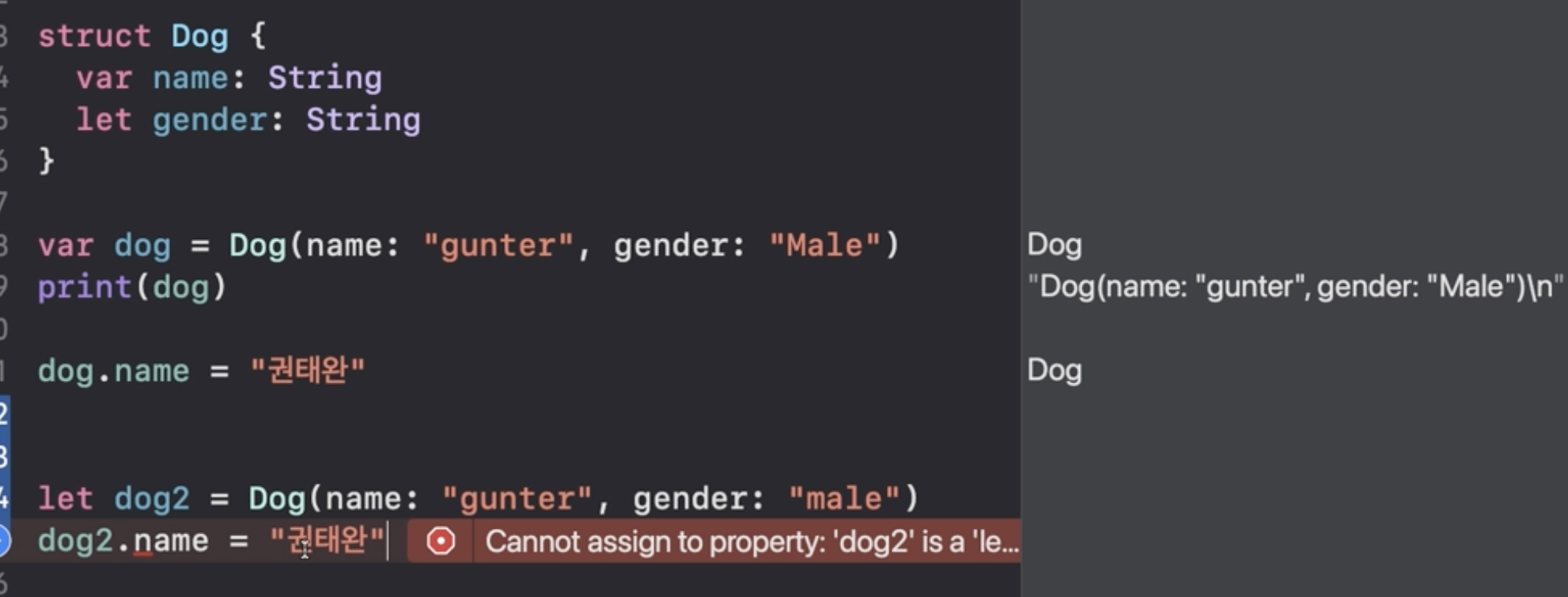 - struct같은 경우 let으로 선언된 객체는 변경 안됨!! 하지만 class는 가능