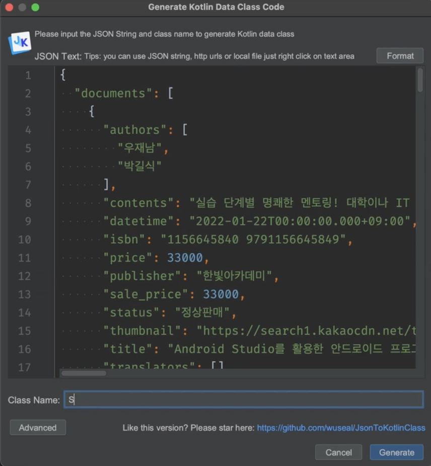- 여기서 meta / documents의 Response를 받기 위해 일단 Model을 만들어 준다. 모델을 만드는 방법은 저번에와 Json To Kotlin플러그인을 이용하여 쉽게 만들어 줄 수 있다. 우선 Response Json을 복사하여 아래와 같이 PlugIn에 붙여준다.