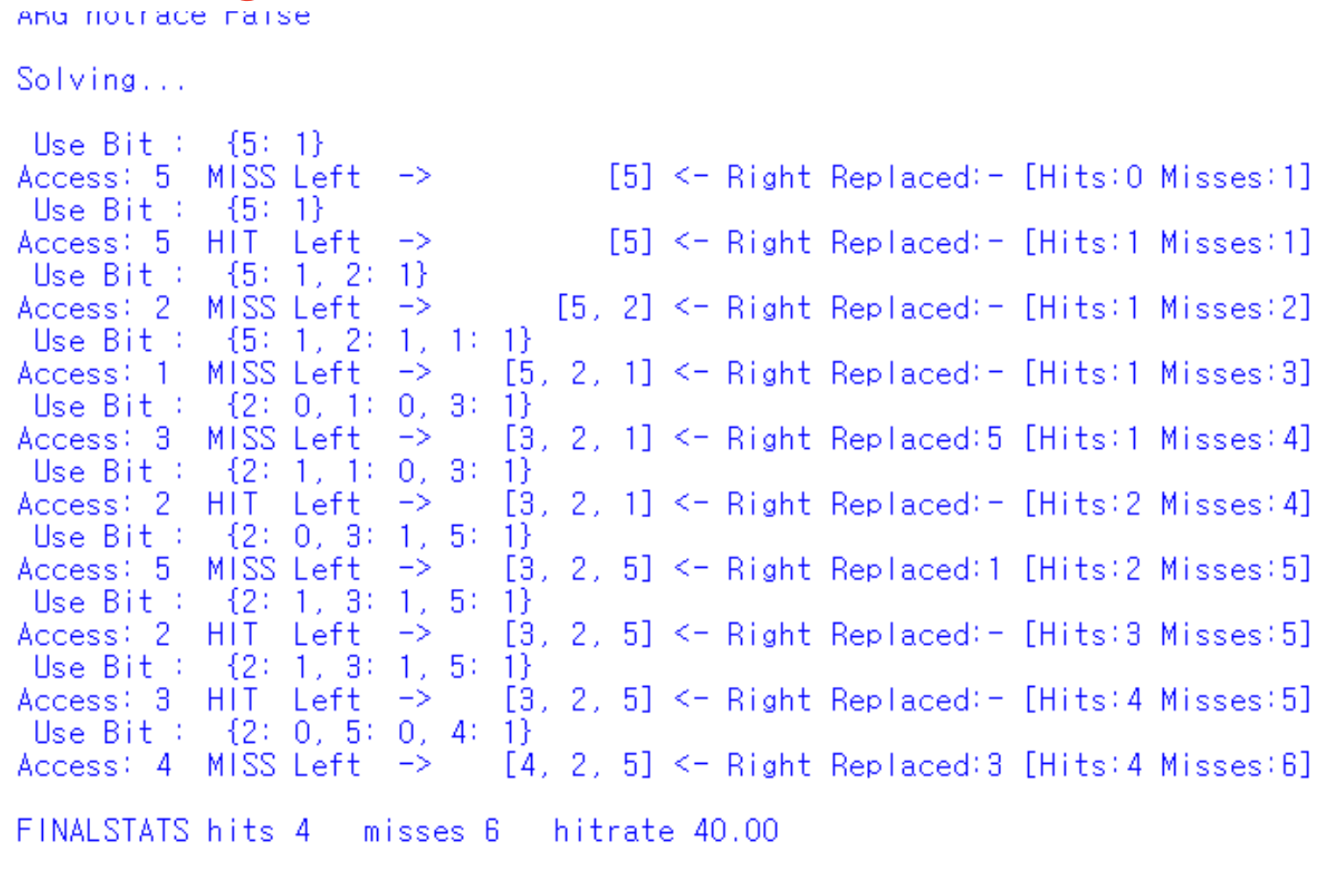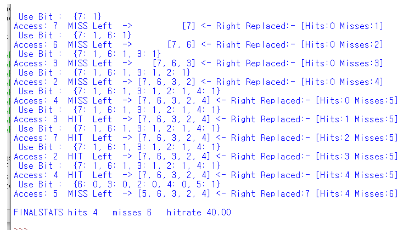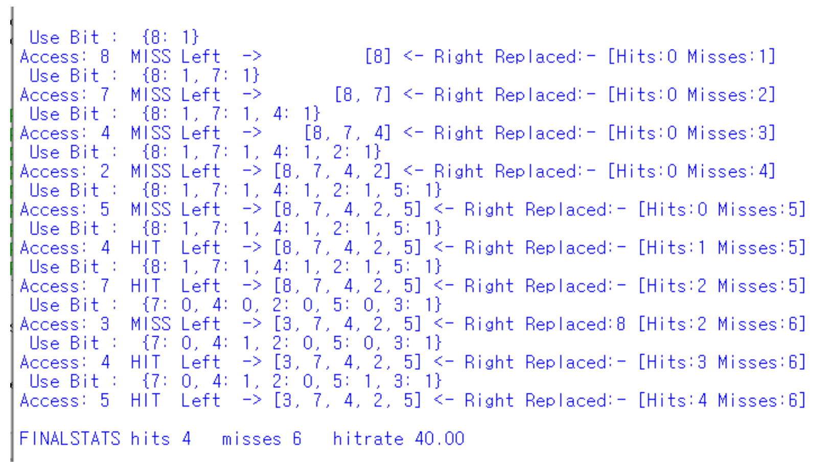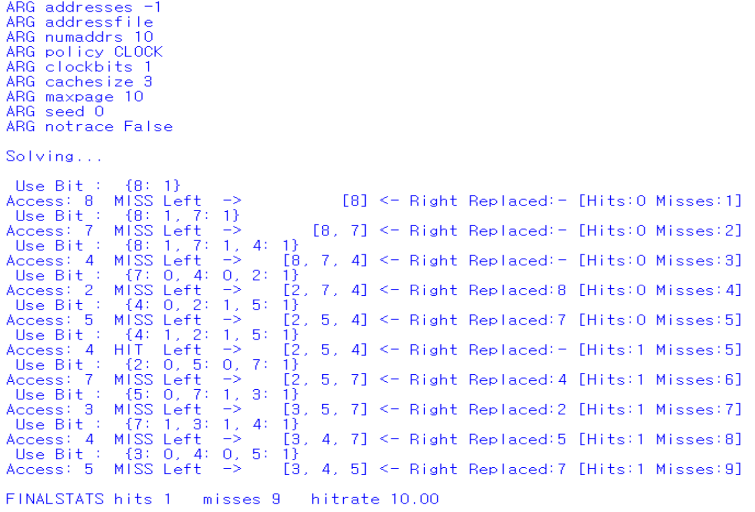 먼저 plicy: clock으로 변경하여 clock알고리즘을 설정해주었고, clockbits를 1로 설정해서 1과 0중 usebit를 가질 수 있게 만들어 주었다. 그리고 compute default 값을 True로 설정해주어 Hit rate의 총 과정과 결과값이 출력이 되게 만들어주었다.
