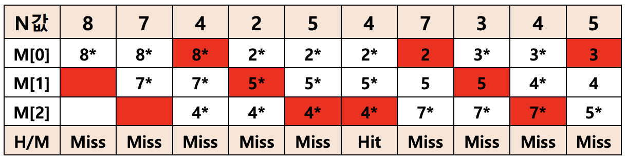현제 설정된 캐시 인덱스 값이 세개 이다. 처음 N값이 들어오게 되면 컨퍼서리 미스가 난다. 이때 고려해줘야할점은 이때도 클락바늘이 증가한다는 것이다.