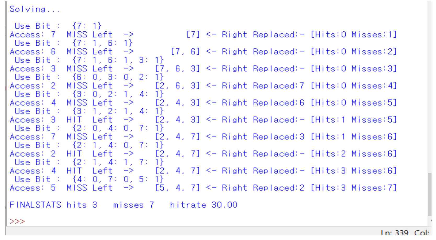 print('Access: %d %s %s -> %12s <- %s Replaced:%s [Hits:%d Misses:%d]' % (n, hfunc(idx), leftStr, memory, riteStr, vfunc(victim), hits, miss))