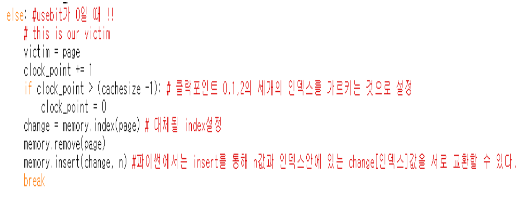 victim값을 바로 클락 방향이 가르키는 page로 설정하고 그값과 새로들어온 n값을 변경해준다, 잘몰랐는데 파이썬에서는 insert를 통해 변경이 가능하여서 memory인덱스를 찾아 victim(제거대상)과 바로 새로운 n값과 변경해주었다.