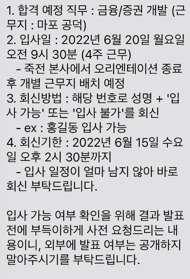 증권개발 직무는 인턴 전환율이 80% 정도 된다고 했으나.. 타기업이 붙은 상태라 최종 거절 의사를 드렸습니다.