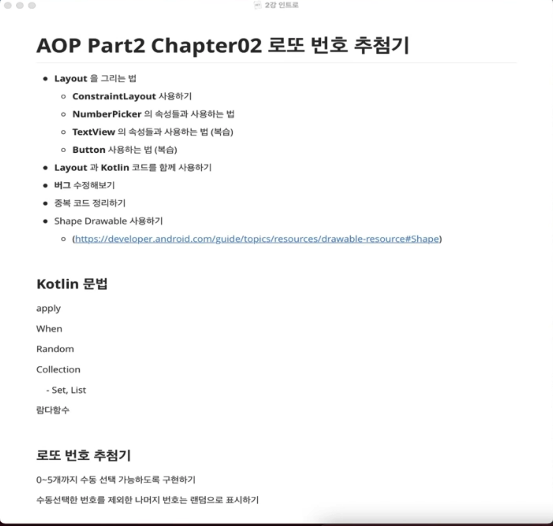 목차 인트로 (완성앱 & 구현 기능 소개) Linearlayout 이용하여 화면 그리기 화면을 이쁘게 꾸며보기 키와 몸무게 입력 화면 기능 구현하기 (1) 키와 몸무게 입력 화면 기능 구현하기 (2) 결과화면 기능 구현하기 아웃트로 (정리) 이 챕터를 통해 배우는 것 Layout 을 그리는 법 LinearLayout 사용하기 TextView 의 속성들과 사용하는 법 EditText 의 속성들과 사용하는 법 Button 사용하는 법 Layout 과 Kotlin 코드를 함께 사용하기 버그 수정해보기 Activity 에 대해 알아보기 Kotlin 문법 when 분기문 람다함수 BMI 계산하기 공식 = 몸무게(kg) / (키 (m) * 키 (m)) 18.5 이하면 저체중 18.5 ~ 23 은 정상체중 23 ~ ..